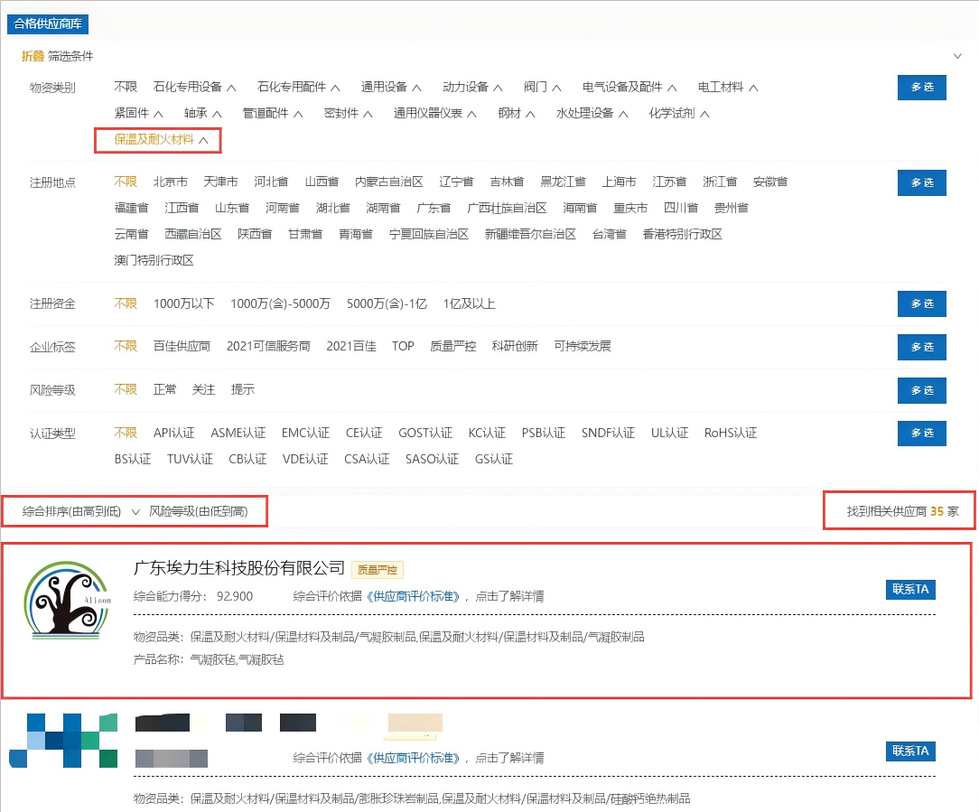 供应链工作委员会主要依托于石化行业供应商寻源平台(蓝蜜蜂平台)开展合格供应商、可信服务商评价工作。据查,在该平台合格供应商库中,公海彩船6600研发能力、质量控制能力、生产能力及管理水平等方面综合得分92.90分,获得“质量严控”称号。截至发稿日,该平台“保温及耐火材料”35家合格供应商中,我司综合得分评价排名第一;全类别1191家合格供应商中,我司综合排名第十。